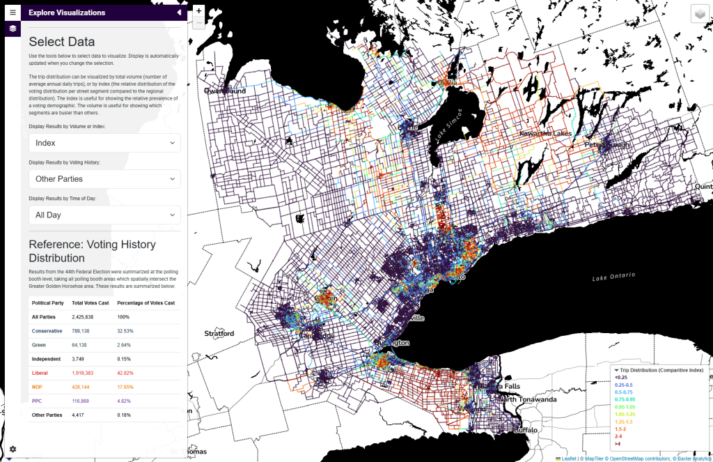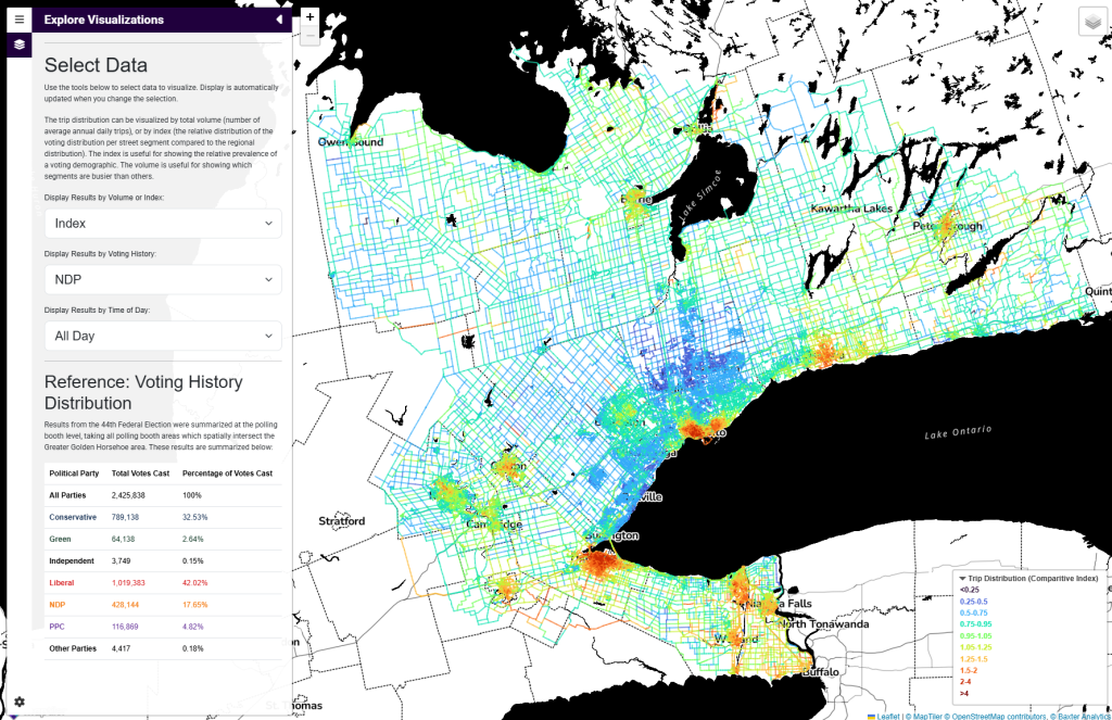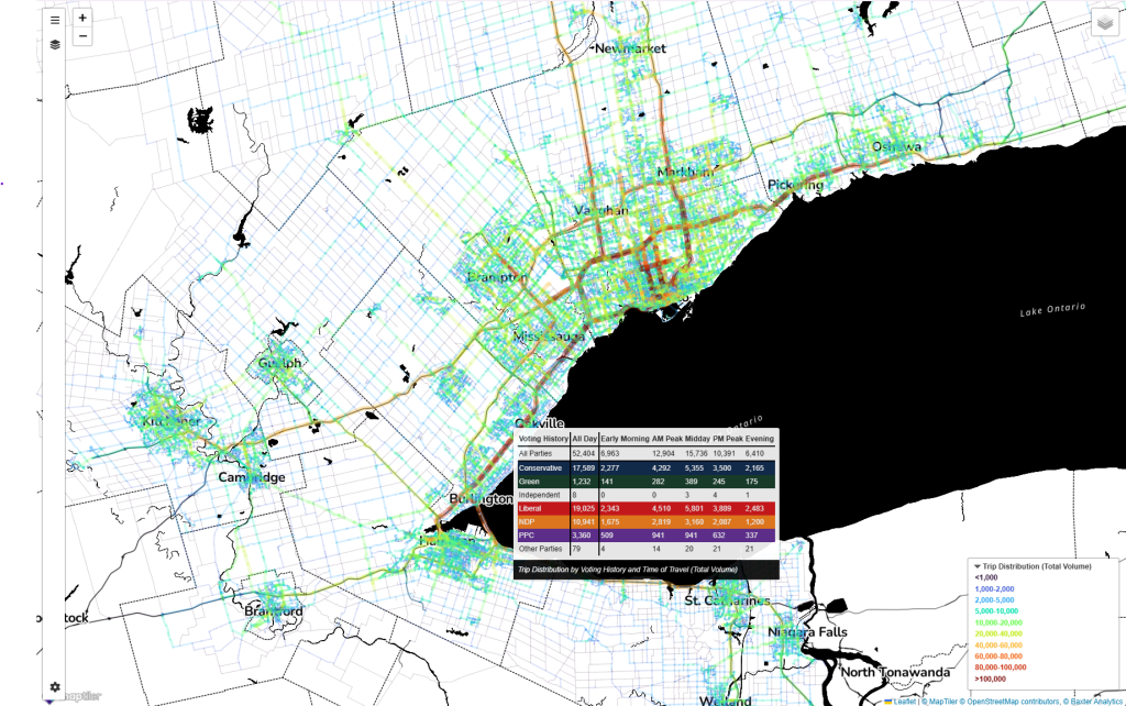 “Where is Main Street?” is an interactive map that visualizes travel behaviour by voting record in the Greater Golden Horseshoe.